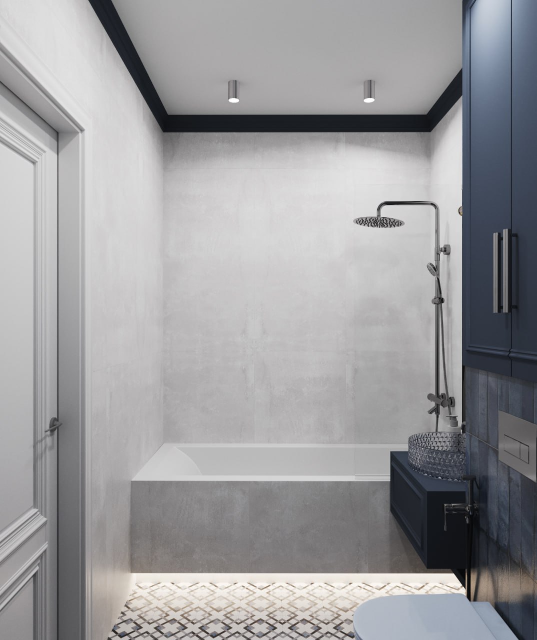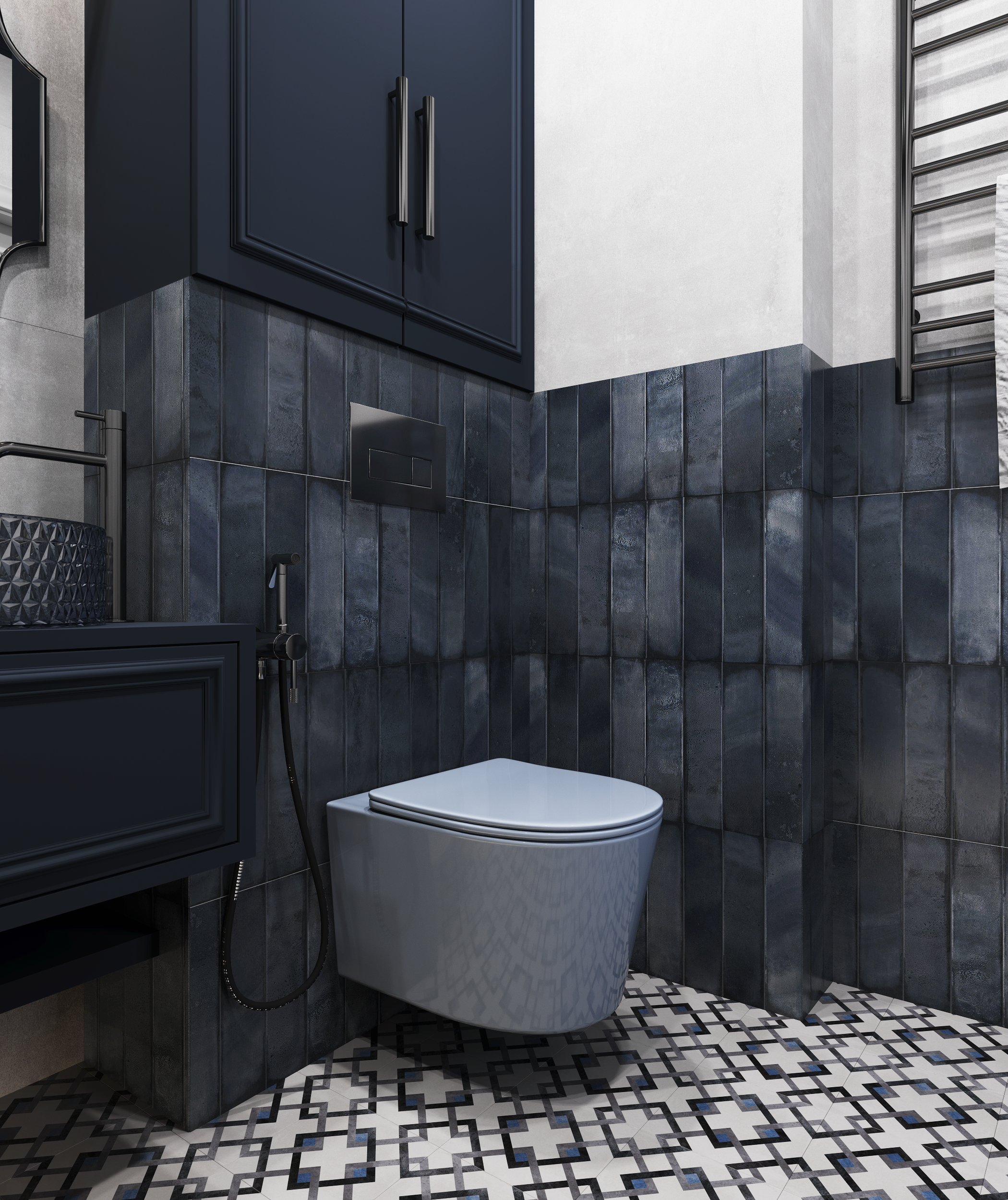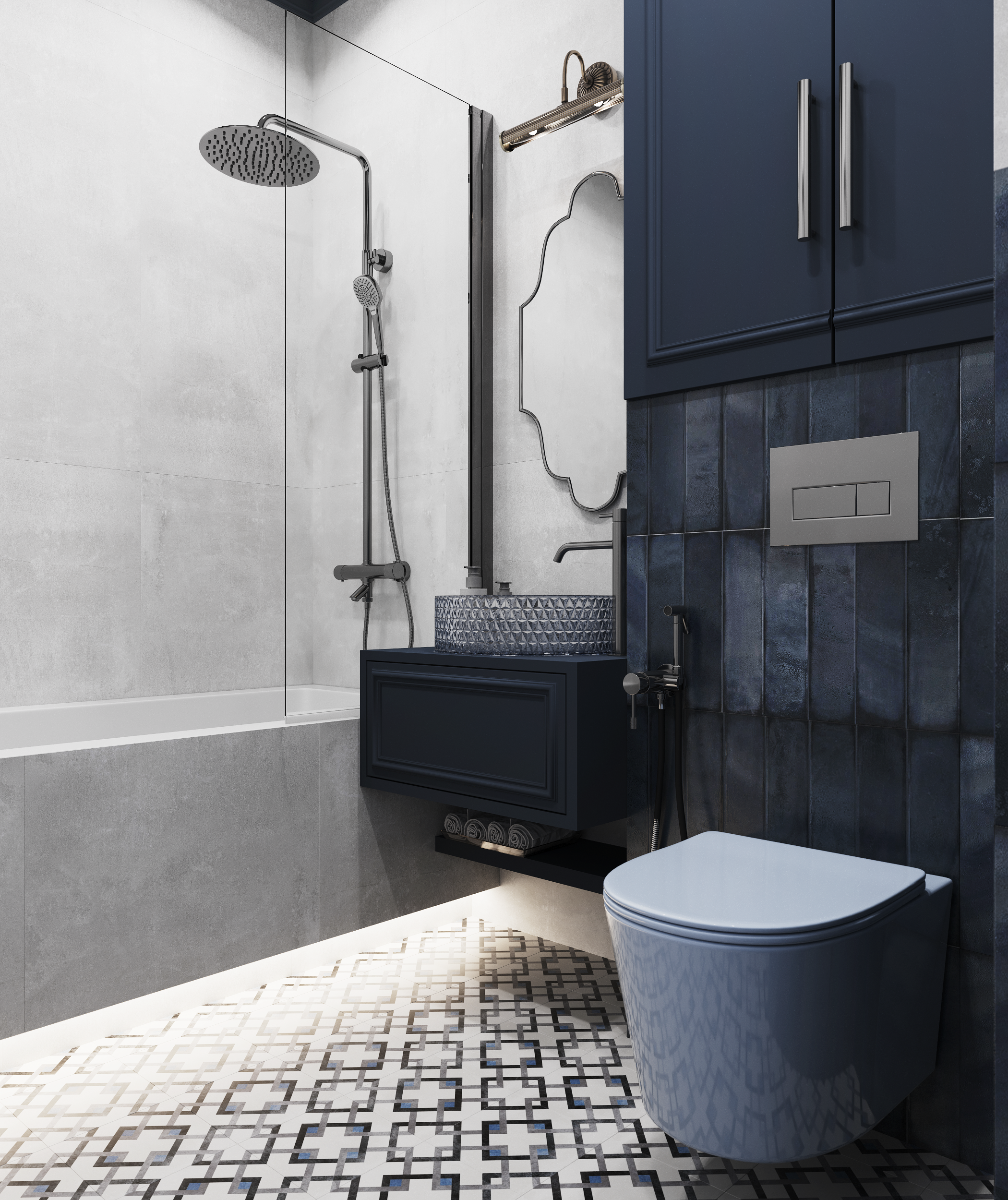 Проект ванной комнаты представляет собой гармоничное сочетание синих и серых оттенков, создающих атмосферу спокойствия и умиротворения. Для акцента на стенах использован керамогранит синего цвета, что добавляет глубину и визуальный интерес. Основной цвет керамогранита использован в светло сером цвете с матовой фактурой, что придаёт помещению современный и элегантный вид.