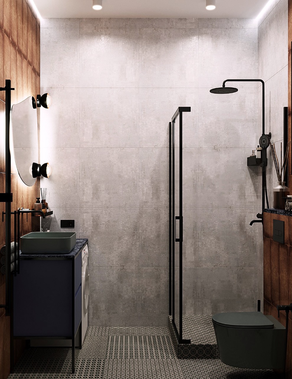 Этот проект, сан узла – для тех, кто готов к смелым экспериментам. Насыщенный терракотовый оттенок, необычное зеркало, строгие черные детали - здесь нет ничего случайного. Это пространство, которое отражает индивидуальность и не боится популяризироваться.