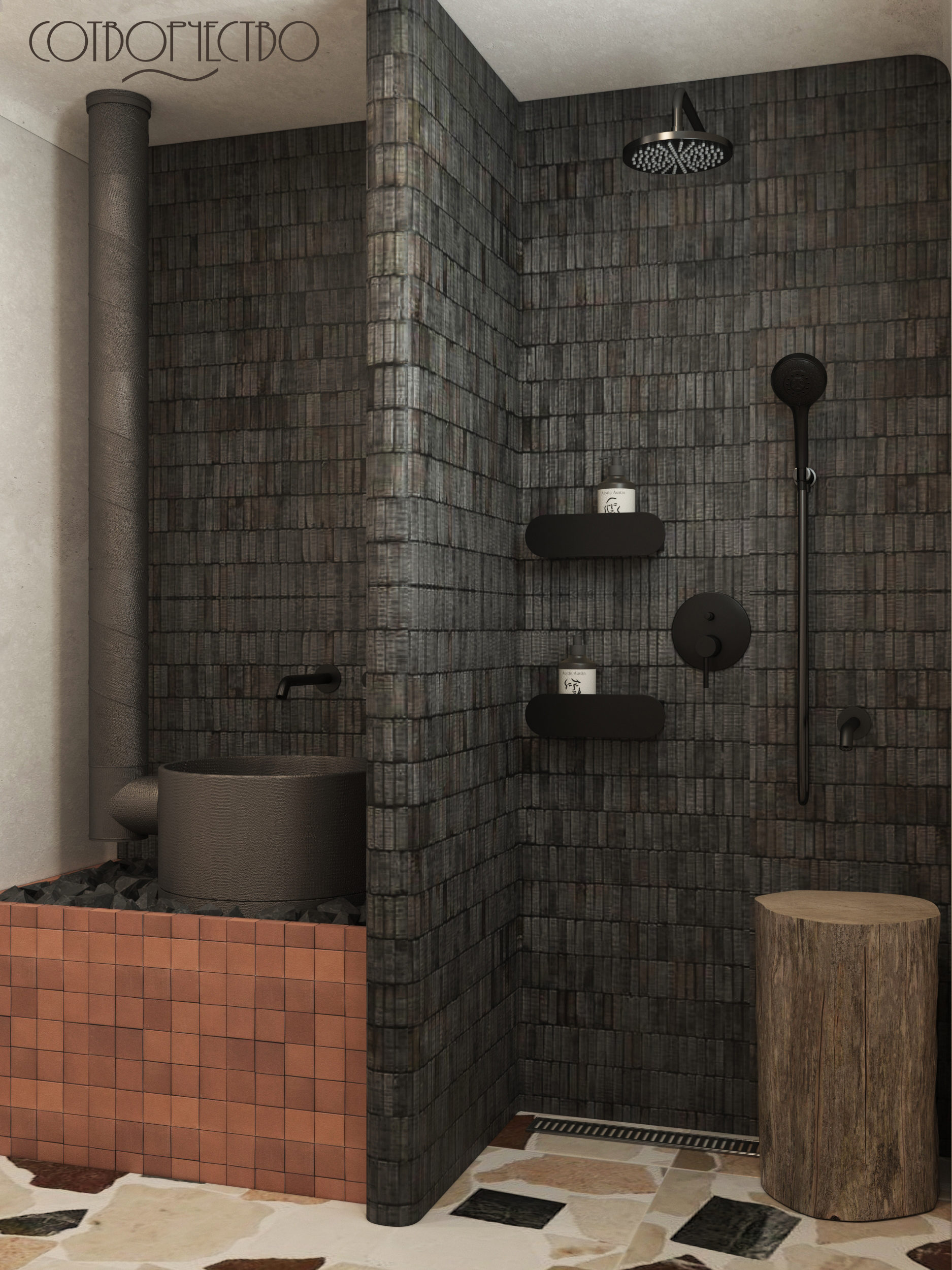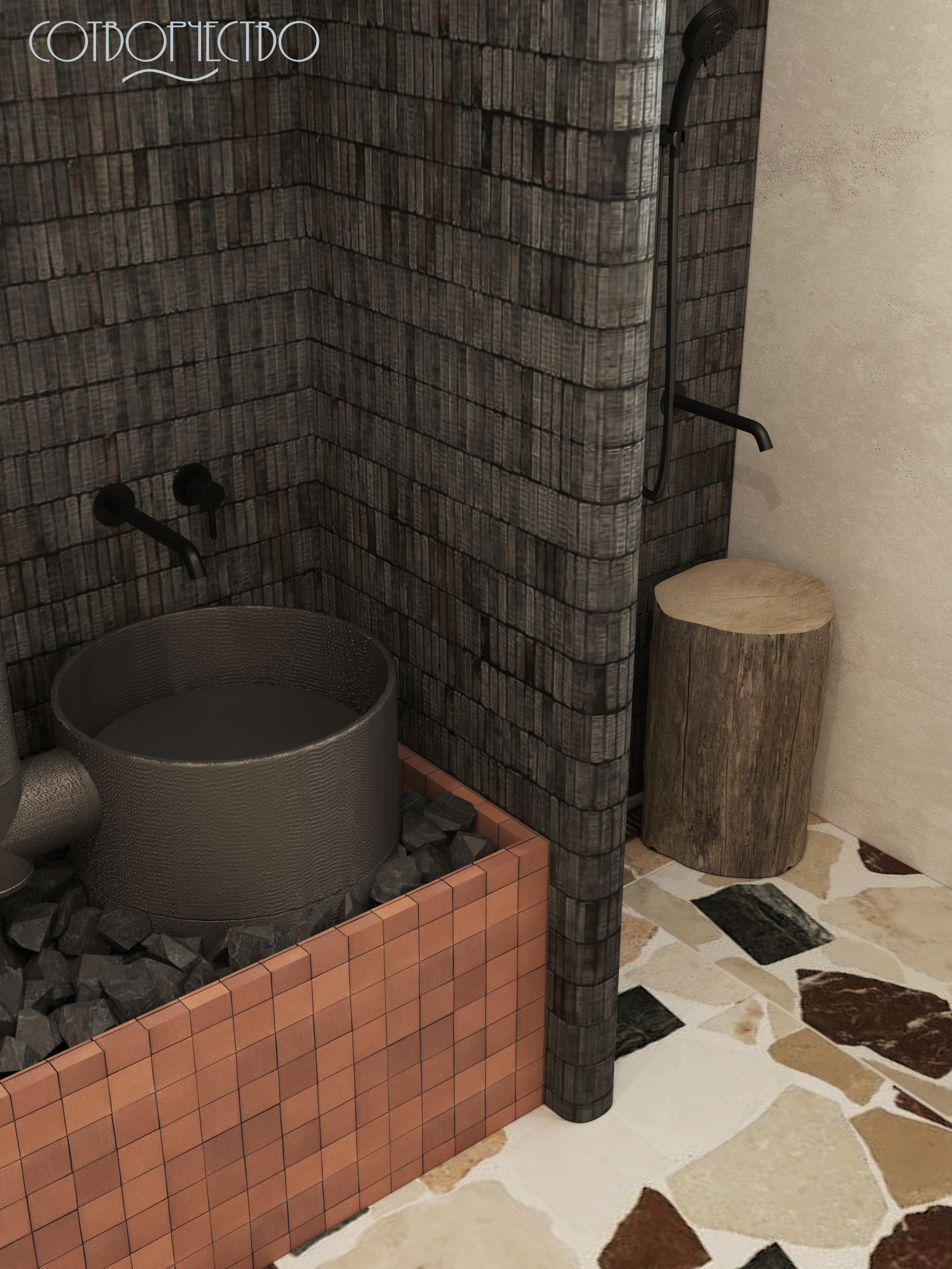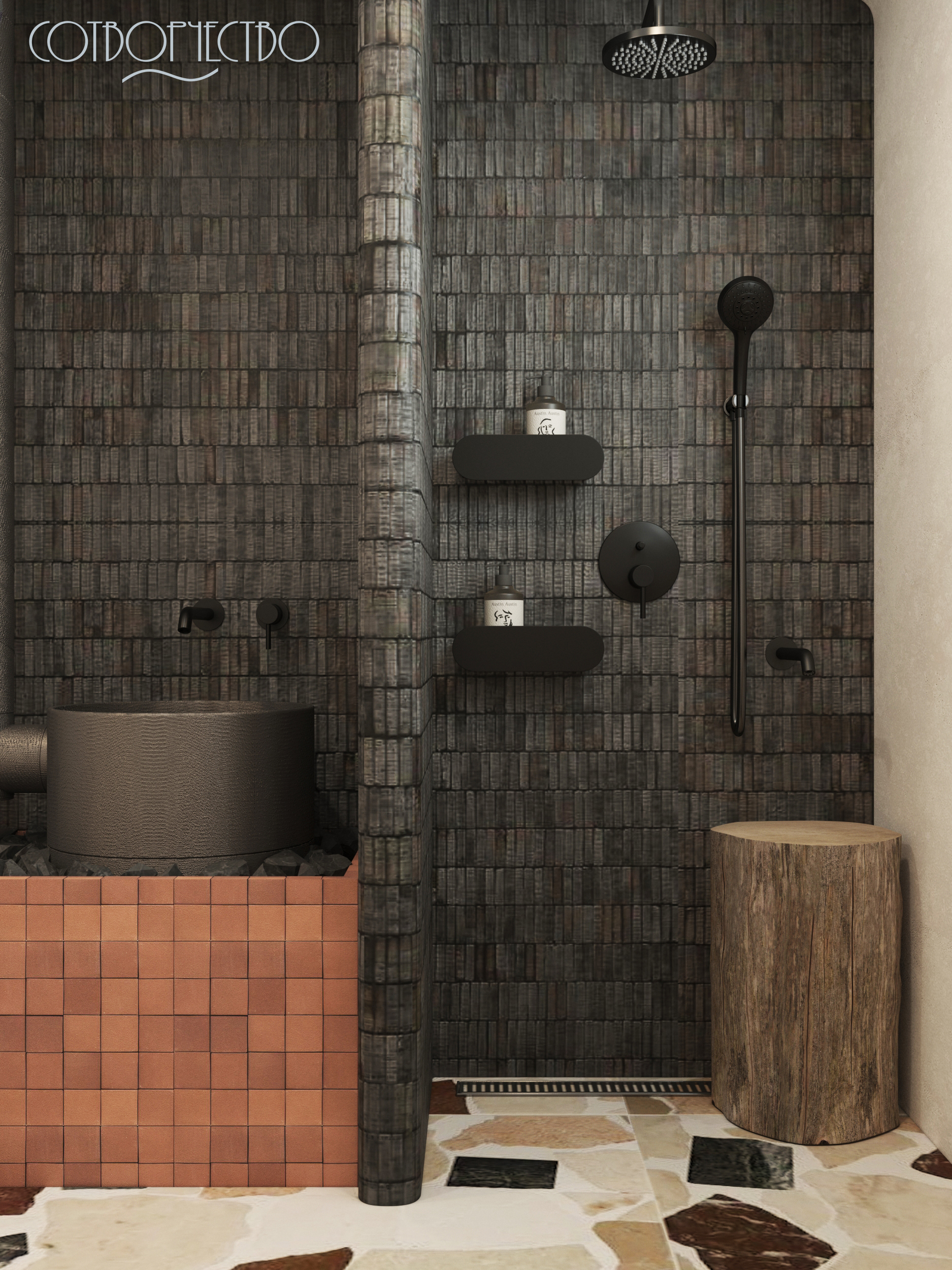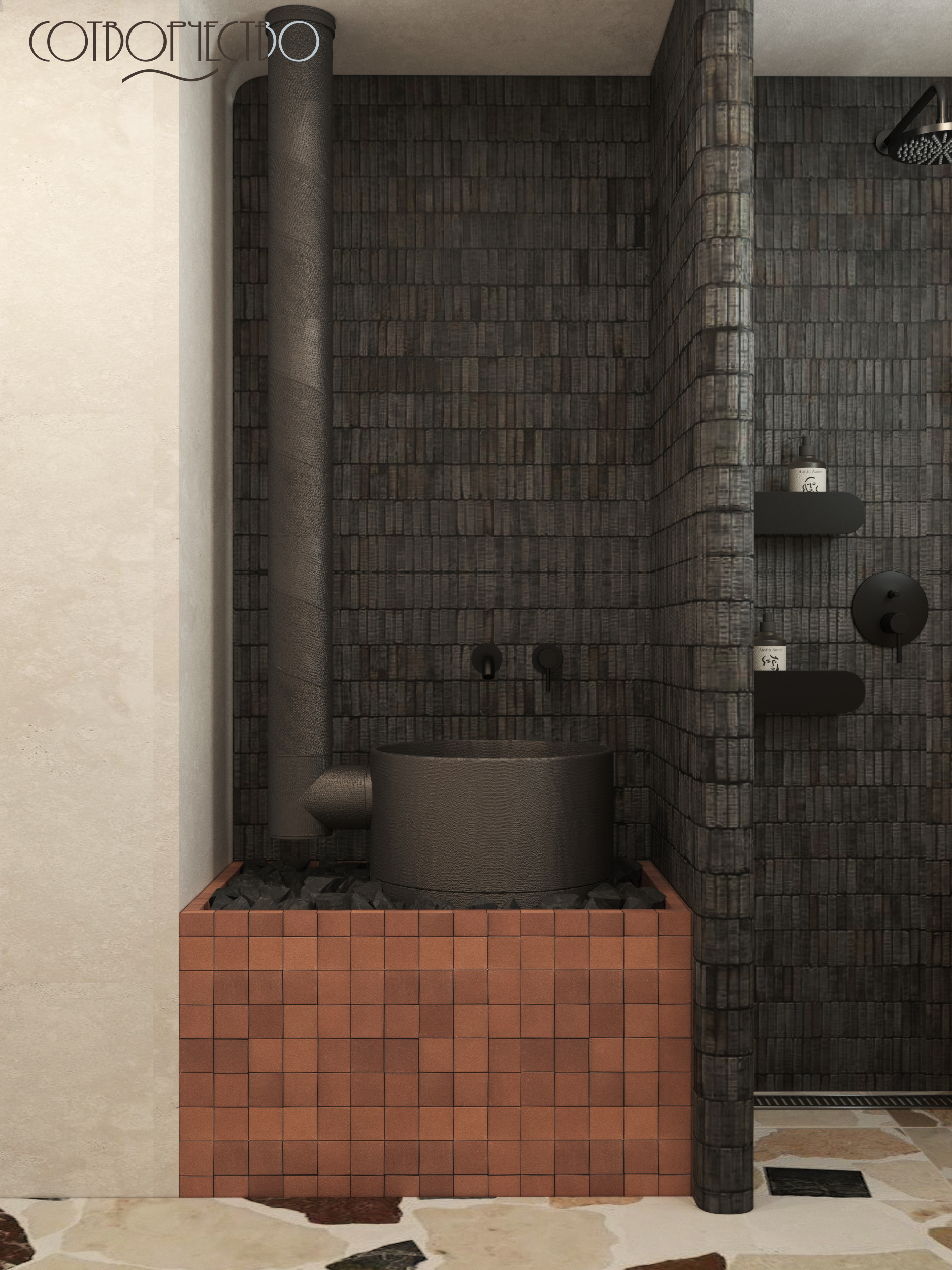 Наш новый проект, наполненный семейными традициями. Объект располагается в Карачаево- Черкесской республике, в ст. Зеленчукская. Это очень важная часть дома, которую необходимо было продумать по функциональному назначению (душ, зона парилки, зона раковины). Пространство наполнено природными мотивами, тактильно приятные материалы, наложение фактур, и, терракотовые акценты, ведь регион славится своей величественной Природой горами, чистыми лесами и озерами. Это вдохновило нас на создание дизайна, а так же с этим проектом нам помог Аквамир!