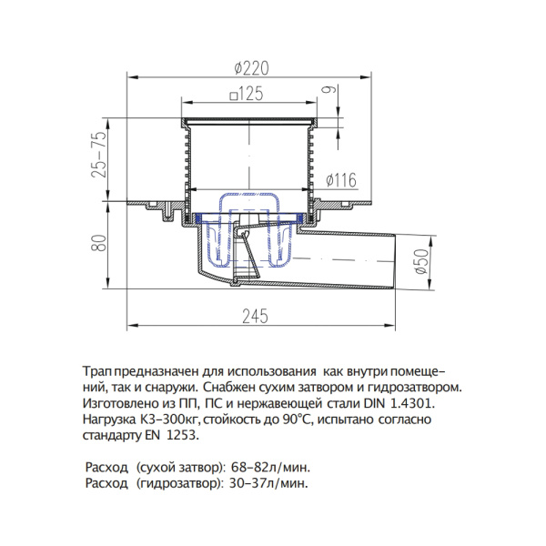 1. Сухие. Конструкцией трапа этого типа предусмотрены клапаны, перекрывающие слив. Заслонка самостоятельно раскрывается, когда появляется напор.