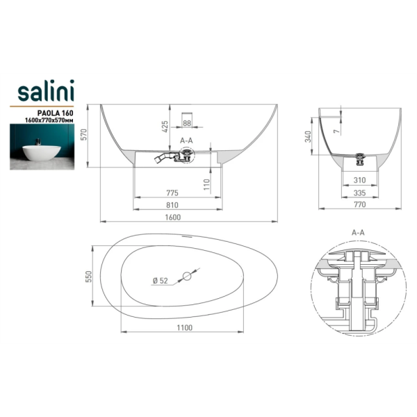 Ванна из искусственного камня Salini Paola Solix S-Sense 160x80 белая, с донным клапаном